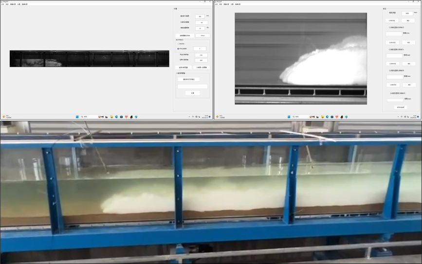 摄像机及镜头为4套,图片分辨率为1200万像素,全幅最大帧频为20fps,镜头为35mmf2d;同步信号发生器为4通道数字延迟或脉冲输出,时间分辨率>10ns;服务器为Intel志强处理器、128GB内存、独立显卡;配套测量软件,可实现重力流运动速度时间演化过程测量,测量精度优于1像素/帧,可实现多相机图像拼接,实现重力流速度不间断监测。同时控制相机进行图像采集、多线程同步记录无丢帧。支持32位或64位的Win10/7操作系统。