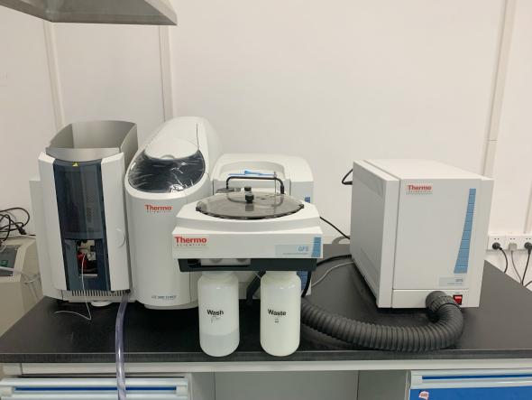 主量元素分析实验室 一、实验室简介 本实验室隶属于西瓜视频 实验中心。主要功能是:(1)岩石、水系沉积物、土壤等样品中主量、痕量元素测定;(2)环境水样中主要阳离子、重金属等浓度测定;(3)固体材料中无机金属元素含量测定。实验室位于实验楼B403。 二、仪器设备 电感耦合等离子发射光谱仪 原子吸收光谱仪 仪器设备:电感耦合等离子发射光谱仪)&原子吸收光谱仪 品 牌:美国ThermoFisher 主要参数: *分辨率 0.005nm~200 nm*线性动态范围 1010*波长范围 165-1100nm,任意谱线 *短期稳定性 RSD% < 0.5*长期稳定性 RSD% < 2.0 ( 4 小时) *Icp-Aes分析速度 73个元素/分钟 三、实验室责任人 李佳 联系电话:13693603527 四、实验预约流程 需与实验室责任人确定样品类型、数量后,下载填写“分析测试申请表”或在平台处系统中预约,在开展实验当天提交纸质申请表。
