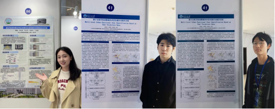 同学向论坛提交了论文并进行了墙报展示。内容分别为“融合粒度和频空特征的模拟实验图像沉积微相自动识别”和“基于出租车轨迹数据的多层次城市功能区识别”,研究内容丰富扎实、展示形式清晰美观,吸引了大量参会者驻足交流。同学们在与同行专家的探讨中拓宽了学术视野,也收获了宝贵的改进建议。
