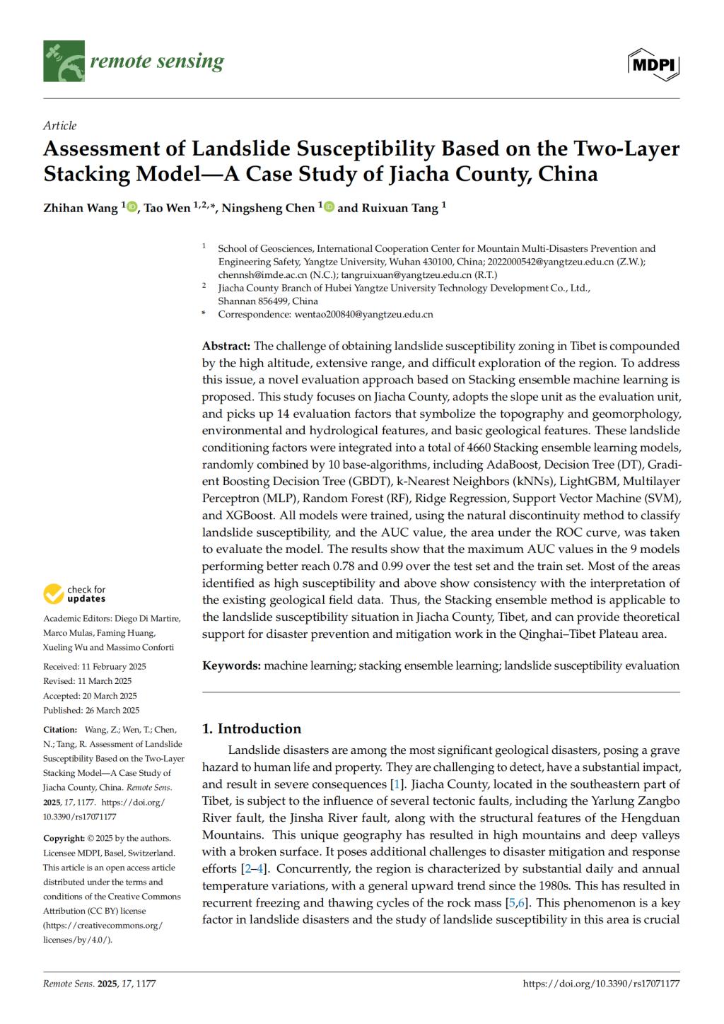 2025年年初,西瓜视频 22级本科生(在读大三)王芷含在《Remote Sensing》(最新影响因子为4.1,位列JCR分区二区,中科院期刊分区地球科学大类二区)上发表了题为《Assessment of Landslide Susceptibility Based on the Two-Layer Stacking Model—A Case Study of Jiacha County, China》的论文(图1,共24页)。全部作者均来自西瓜视频 师生,本科生王芷含为论文第一作者,其导师温韬教授为通讯作者。论文借助两层Stacking集成学习模型对滑坡易发性进行评价,以西藏山南市加查县为研究区,取得了显著成果。