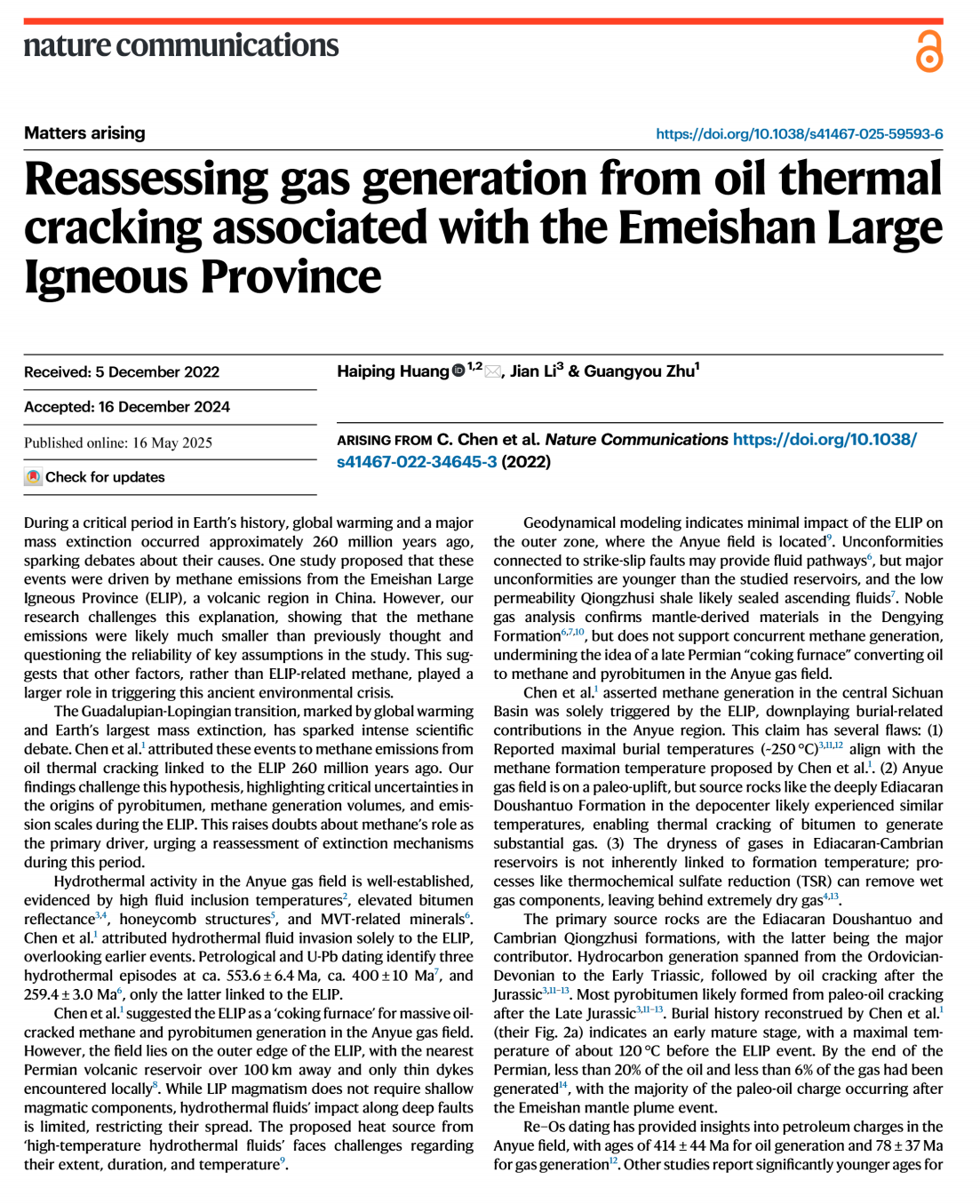 (通讯员 卢志远)近日,西瓜视频 黄海平教授等在国际顶级期刊《Nature Communications》上发表题为《Reassessing gas generation from oil thermal cracking associated with the Emeishan Large Igneous Province》的论文,对峨眉山大火成岩省(ELIP)诱发的原油裂解释放甲烷是否是二叠纪末全球气候剧变和生物大灭绝的主要原因提出了讨论,并对甲烷的生成与释放量进行了重新评估。
