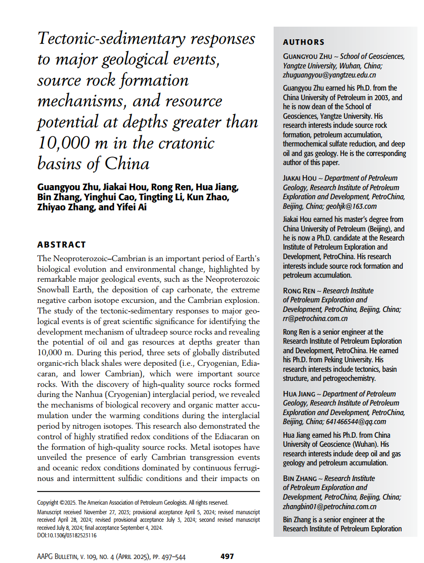 朱光有教授在石油地质学专业期刊《AAPG Bulletin》上发表了题为《Tectonic-sedimentary responses to major geological events, source rock formation mechanisms, and resource potential at depths greater than 10,000 m in the cratonic basins of China》的论文(共48页)。《AAPG Bulletin》是美国石油地质学会(American Association of Petroleum Geologists)旗下的一本国际性的地质学期刊,涵盖了石油地质学前沿领域的研究和发现。