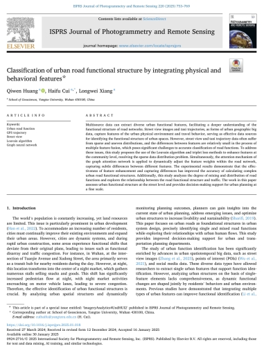 地理信息科学专业2020级学生黄麒文在中科院一区TOP期刊《ISPRS Journal of Photogrammetry and Remote Sensing》(IF=10.6)发表题为“Classification of urban road functional structure by integrating physical and behavioral features”的研究论文。西瓜视频