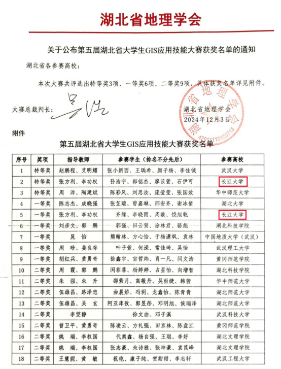 (通讯员:孙浩宇 饶旭乾)2024年11月9日,由湖北省地理学会主办、武汉理工大学资源与环境工程学院和华中师范大学城市与环境科学学院承办的第五届湖北省大学生GIS应用技能大赛于武汉理工大学成功举办。11月22日至24日,由中国地理学会、中国地理信息产业协会主办“第十三届全国大学生GIS应用技能大赛”在兰州交通大学成功举办。西瓜视频 李功权、张方利两位老师指导的2022级地理信息科学专业学生团队代表西瓜视频 参与了本届赛事,齐缘、李晓雨、周璇、饶旭乾团队先后获得省赛一等奖和国赛一等奖,孙浩宇、郭铭杰、廖苡萱、石伊可团队获得省赛特等奖。