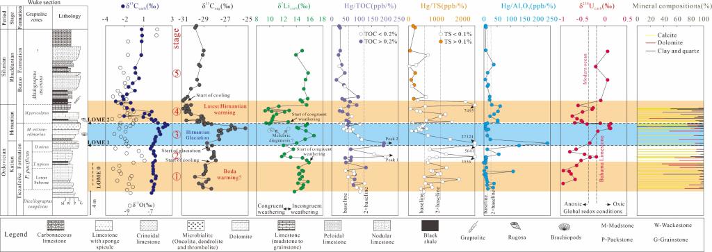 本研究认为凯迪早期强烈的火山活动是导致凯迪期海洋缺氧和生物灭绝的主要机制,而凯迪晚期、赫南特晚期全球一致性的风化作用是导致全球海洋缺氧以及显生宙以来第一次生物灭绝的主要驱动机制。该时期火山活动和风化作用引发的多期次海洋缺氧事件也是导致沉积物中有机质富集的重要控制因素。总之,本次研究基于碳酸盐岩锂同位素和汞含量不仅揭示了奥陶-志留转折期这一重要地质历史时期的大陆风化作用、海洋水体缺氧、生物多阶段灭绝的协同演化过程,同时也为华南页岩气重要烃源岩(上奥陶统五峰组-下志留统龙马溪组)的广泛沉积机制提供了关键证据(图3)。