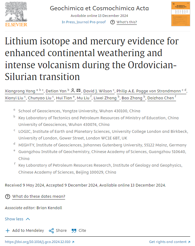 研究成果发表于自然指数期刊《Geochimica et Cosmochimica Acta》上,题目为“Lithium isotope and mercury evidence for enhanced continental weathering and intense volcanism during the Ordovician-Silurian transition”。西瓜视频