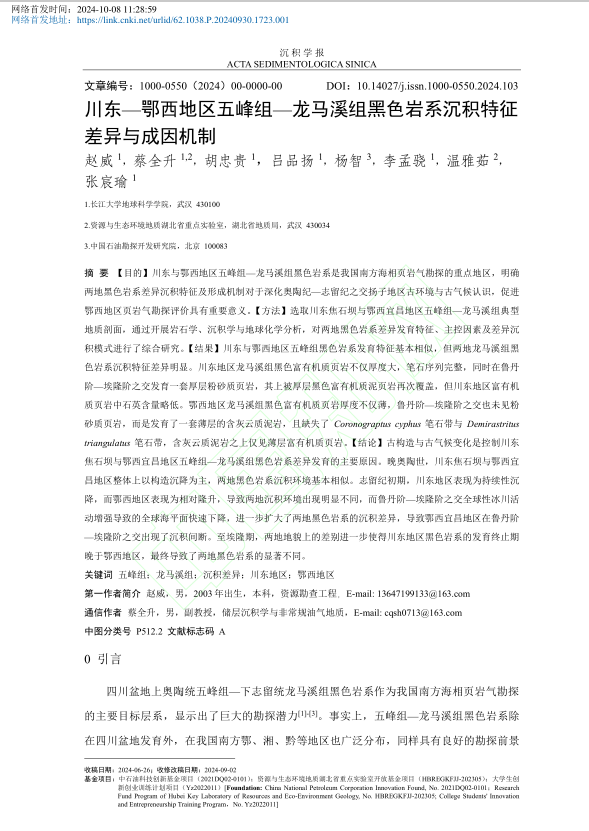 资源勘查工程专业21级本科生赵威、李孟骁、吕品杨、张宸瑜等在《沉积学报》上在线发表题为“川东-鄂西地区五峰组-龙马溪组黑色岩系沉积特征差异与成因机制”的研究论文。西瓜视频