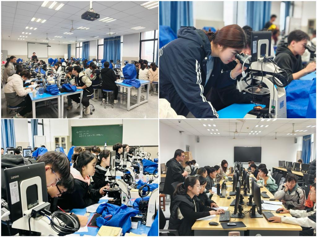 本届地质基本功竞赛分为初赛和决赛两个环节。初赛由来自地科、地物、资环、油工四个学院不同年级和专业的270名参赛选手组成68支队伍积极参与。初赛主要考察学生对常见矿物、岩石的鉴定能力,由实验中心高洁、辛长静等教师精心挑选比赛用标本,并认真严格阅卷。与去年相比,今年决赛的形式继续改革创新。决赛队伍首先要在实验室对三块岩石薄片和两块古生物标本展开鉴定,这一环节重点考察同学们对显微镜使用的熟练程度,同时也考验大家手绘古生物标本和岩石薄片的能力。各队还需要依据自己的鉴定报告制作 PPT 并进行汇报,全面考查大家的综合素质。