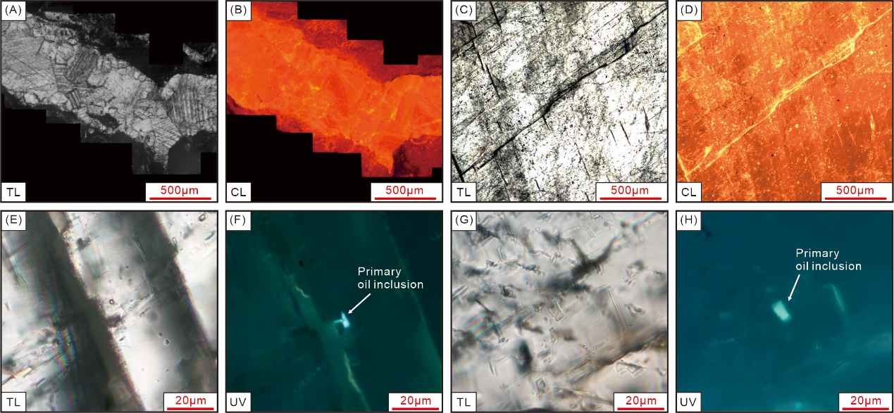 图2 塔河油田奥陶系储层发育方解石脉体(A和C:透射光; B和D:阴极发光);方解石脉体捕获了原生油包裹体(E和G:透射光; F和H:荧光).
