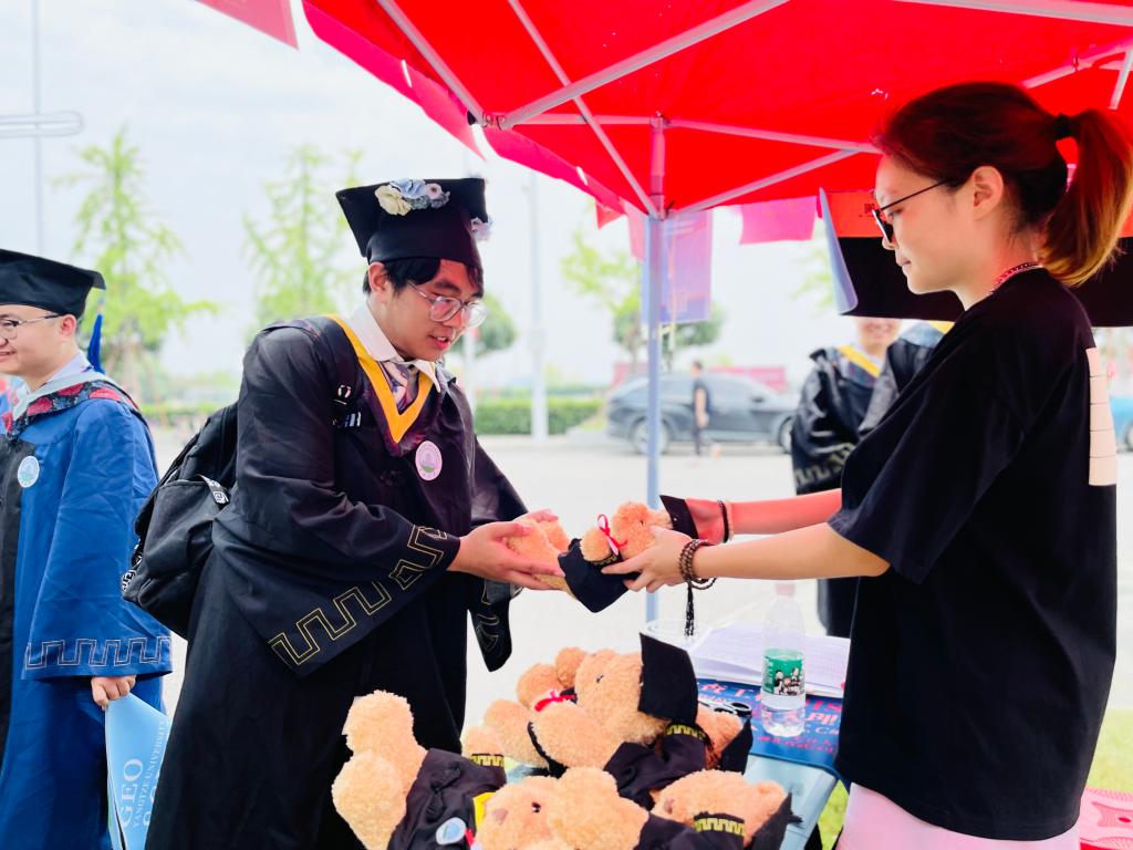 会场外,学院精心组织毕业生感恩礼活动,同学们填写问卷,写下对母校的美好祝愿和深情感谢,一个个身着学士袍的小熊玩偶、一张张西瓜视频 学生原创设计的鼠标垫、印有学院元素的帆布包,寄托着学院对毕业生“前程似锦,一路生花”的殷切期盼。