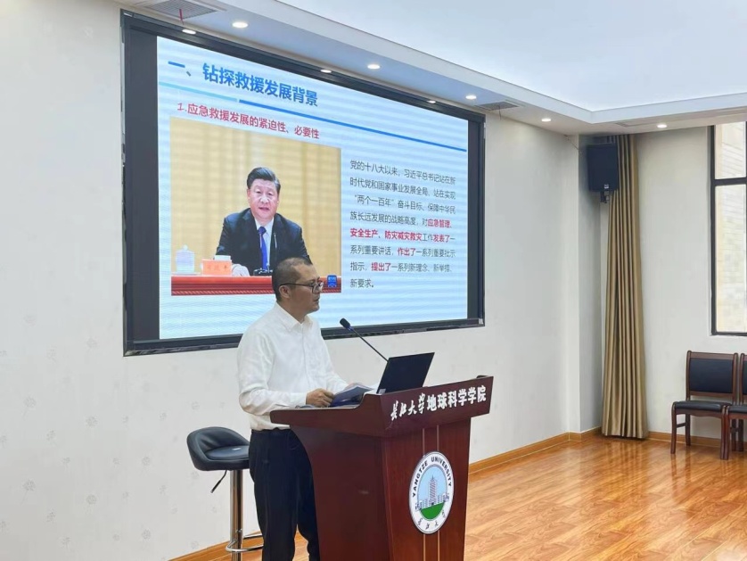 肖明国校友以“矿山灾害钻探应急救援技术现状与发展趋势”为题,运用丰富的救援案例,结合自身的救援经历给学院师生上了一堂生动的生命教育课和思政课。他从钻探救援发展背景、钻探救援关键装备与技术、钻探救援存在问题和钻探救援创新发展趋势4个方面进行了详细讲解,他表示,党的二十大开启了中国式现代化新征程,保障国家能源资源安全关乎国计民生和国家安全,是时代赋予我们地质工作者的崇高使命和重大责任,在国家大安全观思想和新一轮找矿突破战略行动的指引下,新时代“地质报国”大有作为。他寄语地科学子胸怀国家能源资源安全“国之大者”,仰望星空、脚踏实地,让青春在保障国家能源资源安全、全面建设社会主义现代化国家的火热实践中绽放绚丽之花。