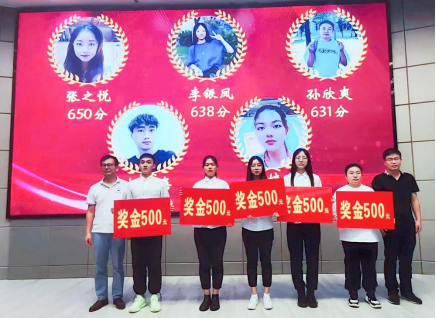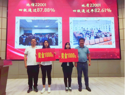 2020级本科生在上半年全国大学生英语四级考试中取得了突破性的好成绩。在副院长韩登林宣读表彰文件后,地信系主任李功权、地质系主任胡忠贵分别为两个四级通过率超过80%的四级先进集体地信22001、地质22001班级代表颁奖;副院长丁四兵与石油系陈鹏书记分别为五名四级均超过600分的优秀个人进行颁奖。