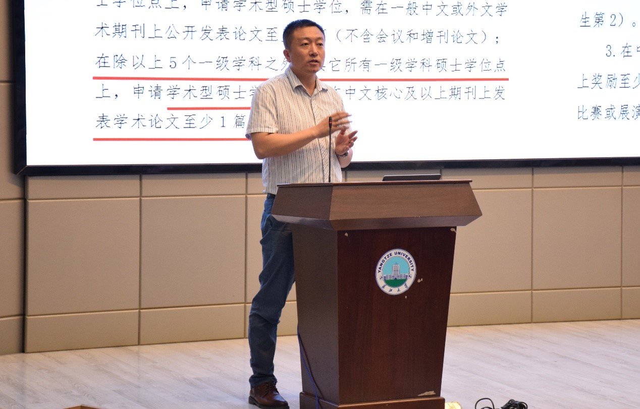 “学院会如何培养大家呢?大家现在毕业需要什么要求呢?学院的奖学金政策是什么样的?下面,我给大家一一解答。”副院长吴楠上台讲道。关于培养流程,他介绍了学制、培养计划、补修课程、中期考核、毕业答辩等方面的内容。关于毕业要求,他详细介绍了不同情况的同学必须达到的论文发表的级别和数目。关于毕业论文的外审要求,他提醒大家,一定要好好学习,写好毕业论文,外审的要求只会越来越严格,希望同学们能按照规定执行,努力使自己成为德才兼备的黄金一代。