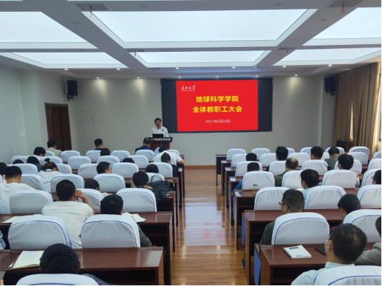在C301学术报告厅召开全体教职工大会,通报布置近期工作,党委书记江万哲主持会议。