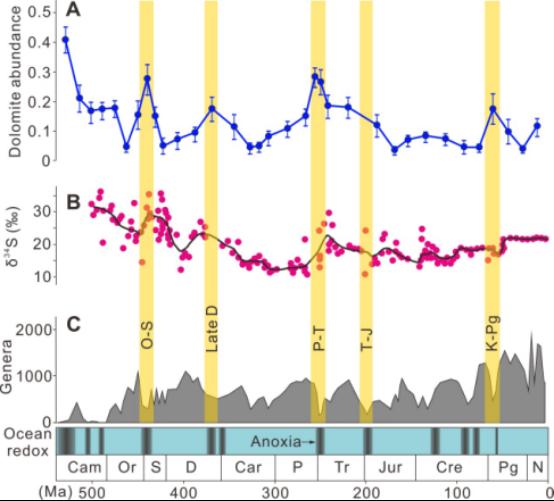 图2.显生宙白云石含量、硫同位素变化、海洋底栖动物属种变化及海洋缺氧综合图。