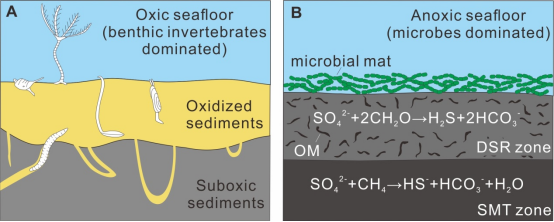 图3.富氧及缺氧海底生物群落及其对表层沉积物氧化还原影响示意图