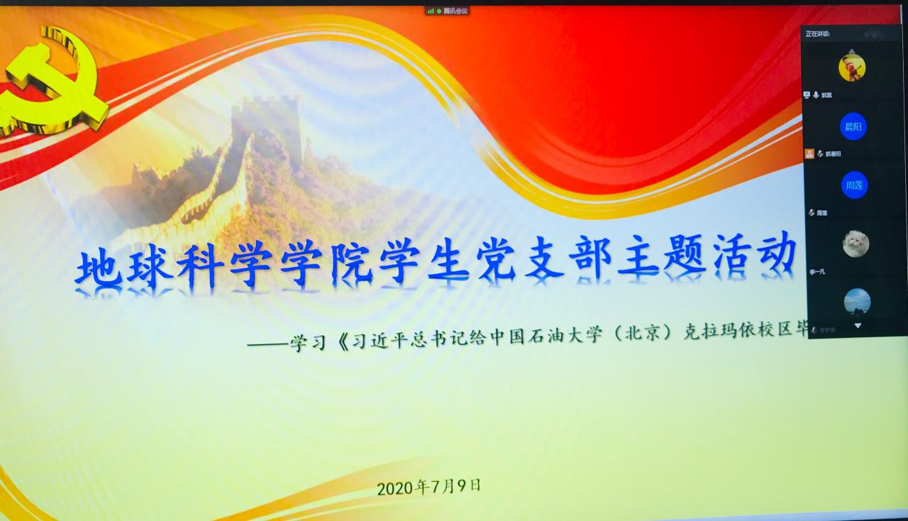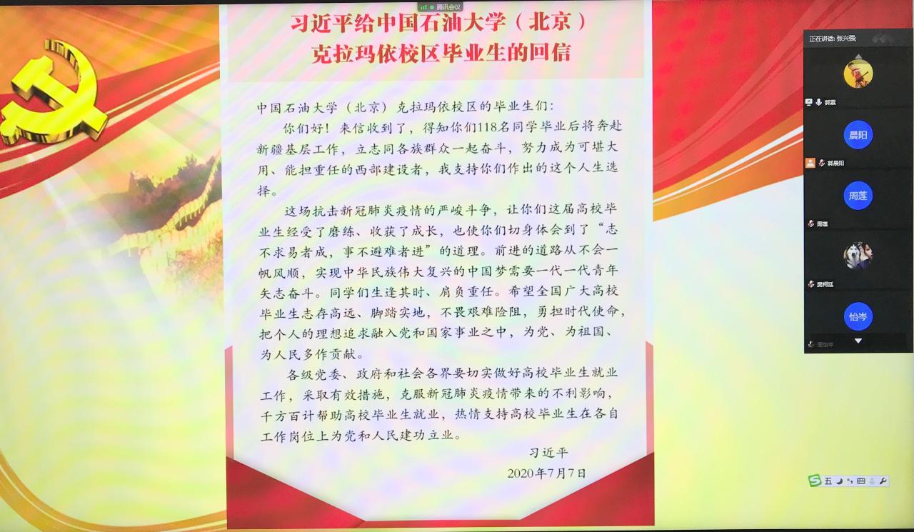 随后,不少党员同志结合工作与学习实际畅谈了自己的感想。毕业生党员张兴强说:“习近平总书记的回信不仅是针对中国石油大学(北京)克拉玛依校区毕业生的,更是对全国高校学生的谆谆教导。我正在中海油天津分公司接收入职培训,今后工作一定会牢记总书记的嘱托,脚踏实地、艰苦奋斗,为祖国的能源安全贡献全部力量。”新发展的预备党员刘威同学说:“2020年是不平凡的一年,从抗‘疫’到抗‘洪’,切实感受到习近平总书记所说的‘生逢其时、肩负重任’,我会时刻以党员的标准要求自己,冲锋在前,勇担使命。” 郭霖老师结合今年本院毕业生就业及升学情况,对大家的发言进行了总结,希望大家今后能继续用自己的实际行动,践行初心和使命,为实现中国梦奉献智慧和力量。