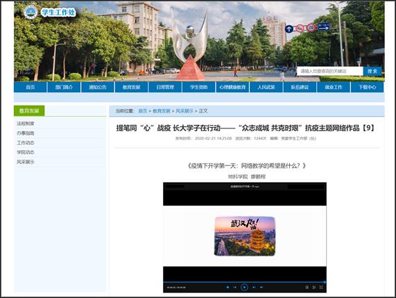 讲好抗“疫”思政课,传递战“疫”正能量。疫情期间的开学第一天,廖鹏程老师制作发布“众志成城 共克时艰”抗疫主题网络视频《网络教学的希望是什么》,通过QQ空间、B站、抖音、微博、腾讯视频、西瓜视频以及学校学工部官网宣传,利用新媒体平台讲好特殊时期的思政课。