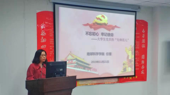 随后,任倩副书记作标题为《不忘初心、牢记使命——大学生党员的“先锋范儿”》的党课报告。任书记首先介绍了“先锋”的含义,引出学生党员如何发挥模范带头作用这一论题。从学生党员发展原则、学生党员入党流程、学生党建工作标准的角度,任书记介绍了西瓜视频