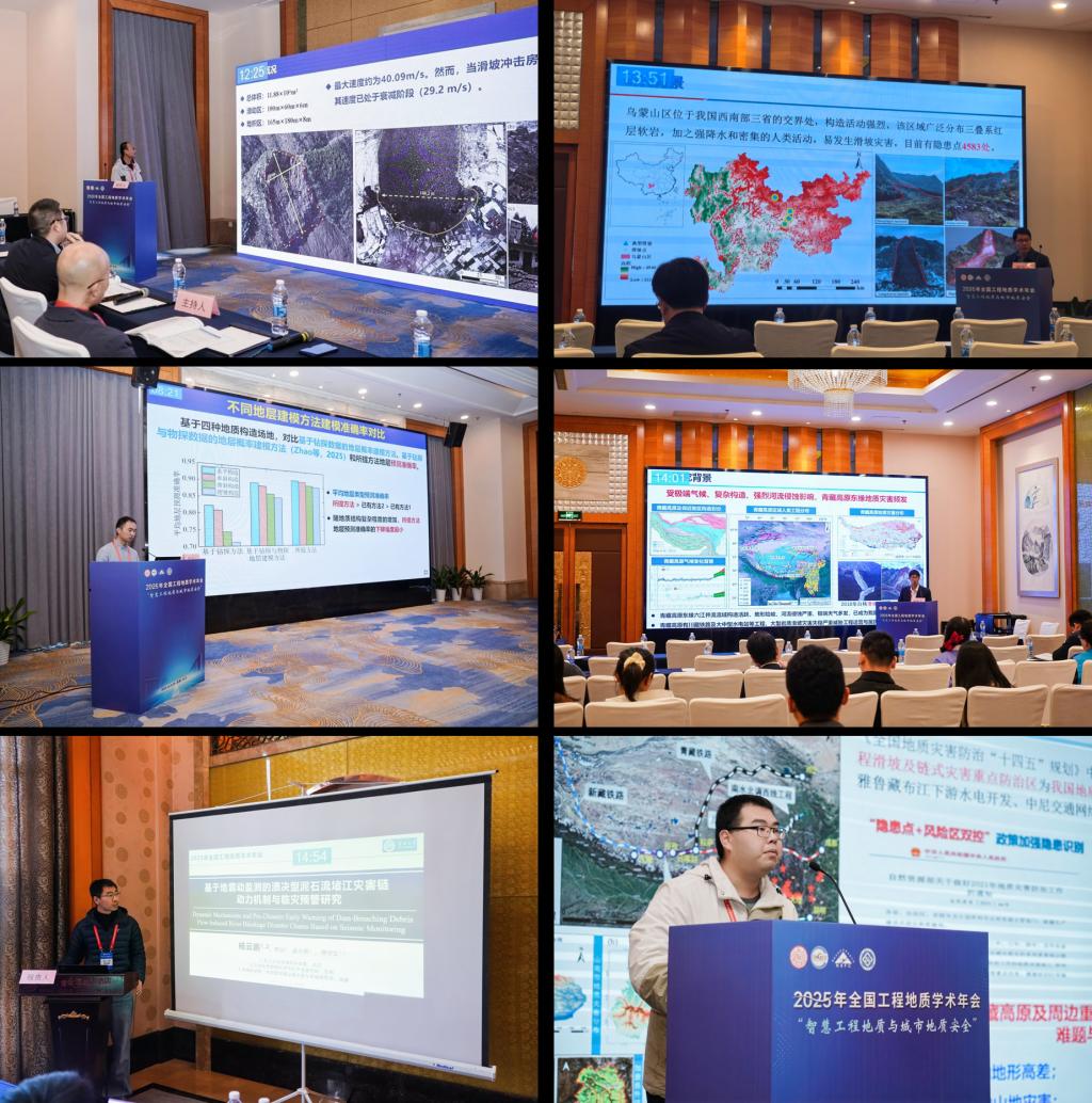 温韬、王艳昆、薛阳、张勃成、杨云鹏、赵超共6名教师,硕博士研究生17名、本科生2名参加了此次会议。王艳昆副教授受陈宁生教授委托作了题为“冻胀可能引发2024年1月22日镇雄特大滑坡”的特邀报告。温韬教授在分会场作了题为“基于干湿-冻融循环崩解试验的镇雄-筠连式滑坡成因机制分析”的口头报告。赵超教授在分会场作了题为“基于钻探与物探数据融合的地层结构概率建模研究”的口头报告。张勃成副教授在分会场作了题为“雅砻江上游互层反倾斜坡倾倒变形演化机理与稳定性研究”的口头报告。杨云鹏副教授在分会场作了题为“基于地震动监测的溃决型泥石流堵江灾害链动力机制与临灾预警研究”的口头报告。本科生王芷含同学在研究生分会场作了题为“遥感与人工智能视角下的青藏高原地区滑坡灾害”的口头报告。工程地质中心研究团队报告涵盖了从极微观岩石力学特性到极宏观区域灾害链分析等多个尺度,充分融入智慧工程地质议题,以全新视角对地质灾害孕灾、成灾、致灾机制进行解释,展现了西瓜视频