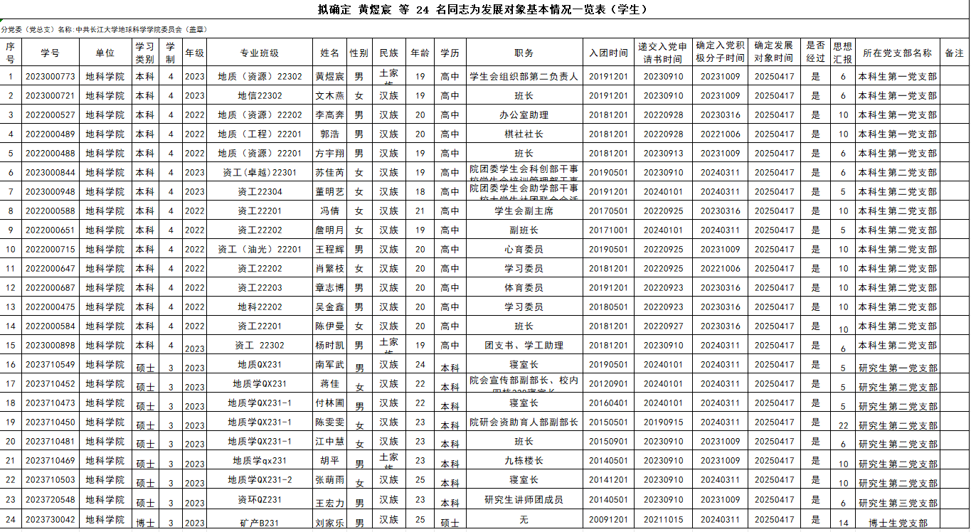 附:拟确定 黄煜宸 24 名同志为发展对象基本情况一览表