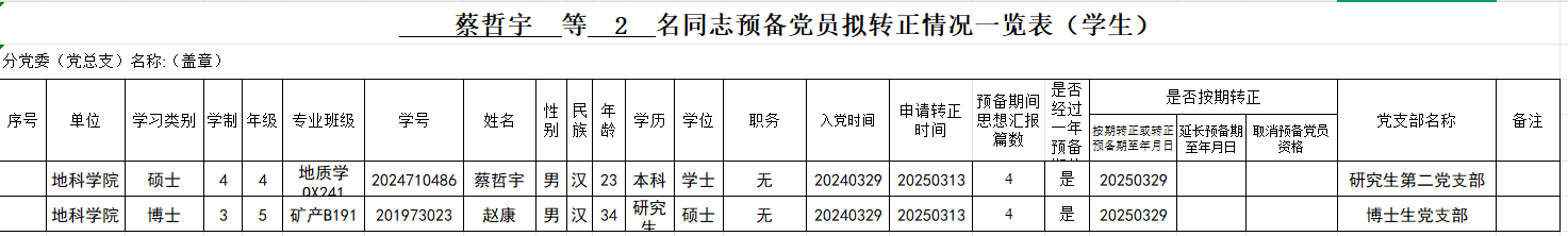 附: 蔡哲宇   2 名同志预备党员拟转正情况一览表