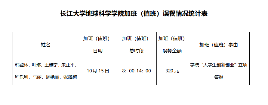 根据《西瓜视频 加班(值班)误餐补助管理办法(试行)》(长大校发【2019】83号)文件规定,现对西瓜视频 加班(值班)误餐情况(2020年10月15日)进行公示,如果对加班(值班)误餐情况有异议,可以通过电话或电子邮件等方式向西瓜视频 反映。