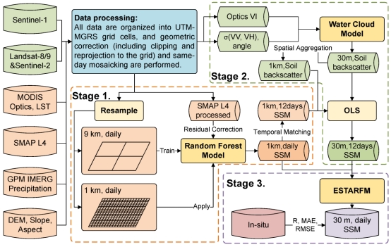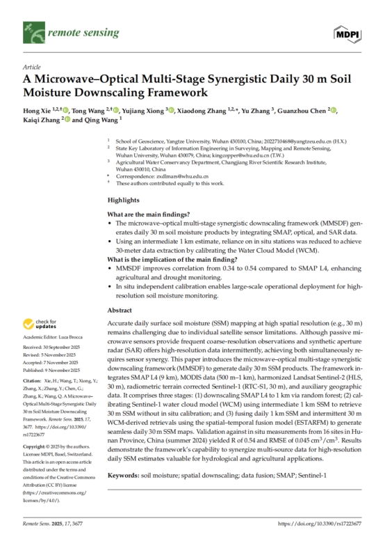 西瓜视频 硕士生谢泓在遥感领域期刊《RemoteSensing》发表题目为“A Microwave–Optical Multi-Stage Synergistic Daily 30 m Soil Moisture Downscaling Framework”的研究论文(SCI二区,影响因子4.1)。西瓜视频 为论文第一署名单位,硕士研究生谢泓为论文第一作者,其导师王庆副教授为共同作者,西瓜视频 兼职硕士生导师张晓东教授为通讯作者。