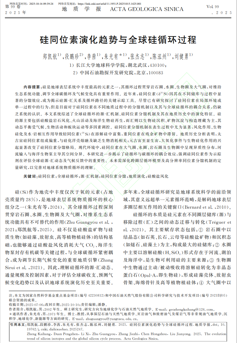 2024级地质学专业硕士生郑凯航以第一作者身份在中文EI检索期刊《地质学报》上发表题为“硅同位素演化趋势与全球硅循环过程”的研究论文(图1)。硕士生郑凯航为论文第一作者,其导师朱光有教授为论文通讯作者,西瓜视频