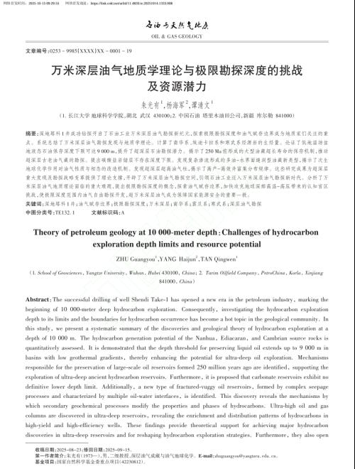 近期,西瓜视频 朱光有教授应邀在《石油与天然气地质》杂志上撰写“万米深层油气地质学理论与极限勘探深度的挑战及资源潜力”文章(共19页),系统总结了万米深层油气勘探发现与地质学理论。(1)刻画了南华系、埃迪卡拉系和寒武系烃源岩的空间展布规律,计算出关键地质历史时期的生气强度和生烃量,奠定了超深层油气勘探的资源基础,为开辟万米深层勘探空间和预测万亿立方米大气田分布区打下了基础。(2)论证了低地温场盆地液态石油保存深度下限可达9000 m,突破了石油勘探深度下限6000 m的传统认识,提升了超深层石油勘探潜力,并被近期超深井钻探证实。(3)揭示了2.5亿年前形成的大型油藏超长寿命的保存机制,修订了油气藏保存极限寿命的界定,推动超深层油气勘探重大发现与战略突破。(4)超深层碳酸盐岩储层非均质性极强,古老碳酸盐岩储层不存在深度下限。(5)发现复杂渗流形成的多油水界面缝洞型油藏新类型,提出横纵向无统一边界的大面积层状缝洞型油藏断珠体概念,丰富了油气藏类型,突破了传统背斜高点找油理论。(6)建立了原油裂解程度和油气相态的快速判识图版,揭示了次生地球化学作用对油气性质与相态的改造机制。(7)发现超深层超高油气柱,油柱高度近千米的油藏,揭示了高产高效井富集分布规律,打破油气勘探黄金带理论,揭示了万米深层超高油气柱形成与富油气区分布机制。这些研究成果为超深层重大发现及勘探战略变革提供了理论支撑,开辟了万米深层油气勘探空间。