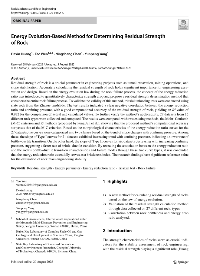 2023级研究生黄德昕在期刊《Rock Mechanics and Rock Engineering》(最新影响因子为6.6,位列JCR分区一区,中科院大类一区)上发表论文“Energy Evolution-Based Method for Determining Residual Strength of Rock”。西瓜视频