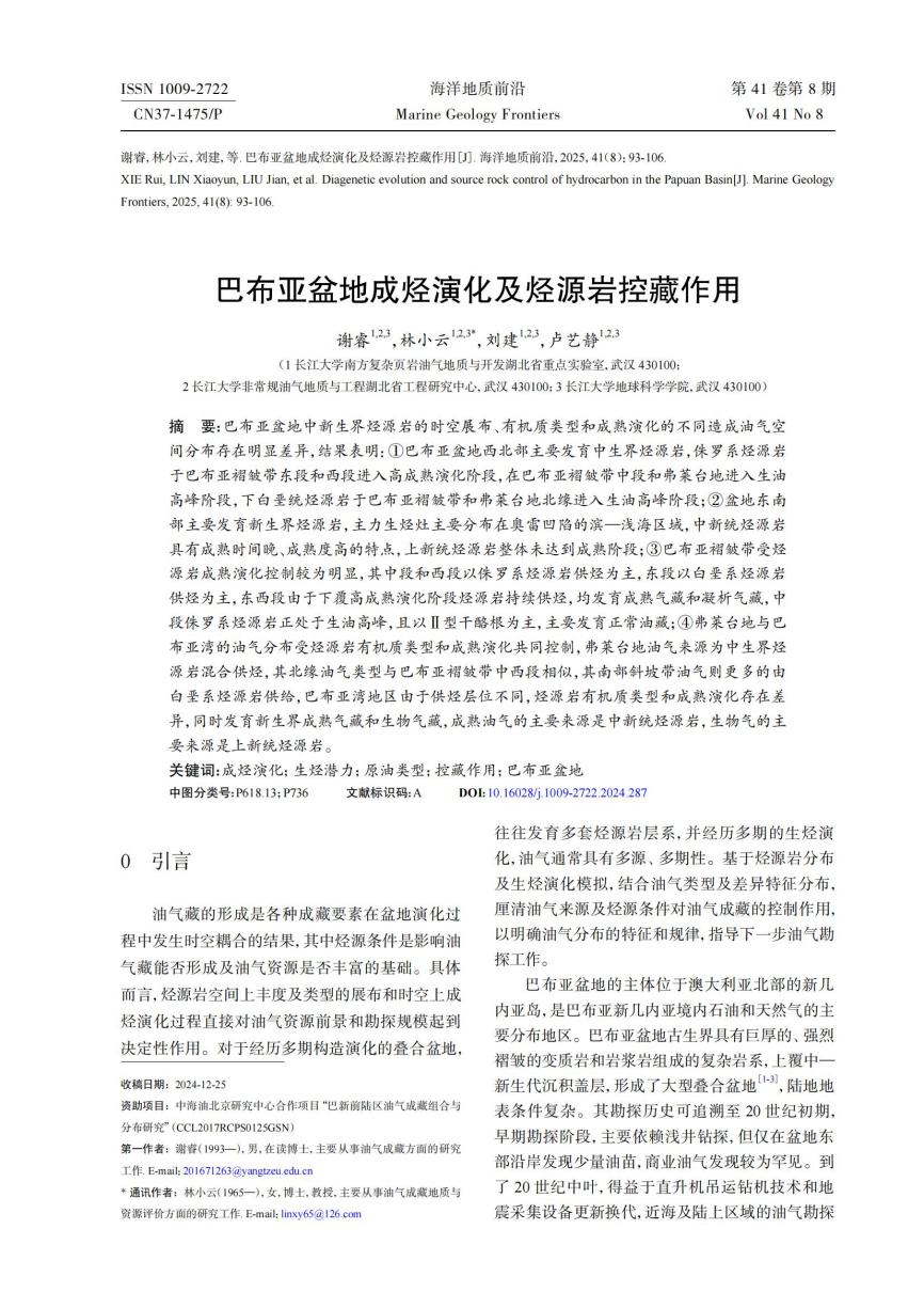 西瓜视频 博士研究生谢睿在《海洋地质前沿》发表论文分析巴布亚盆地成烃演化及烃源岩控藏作用