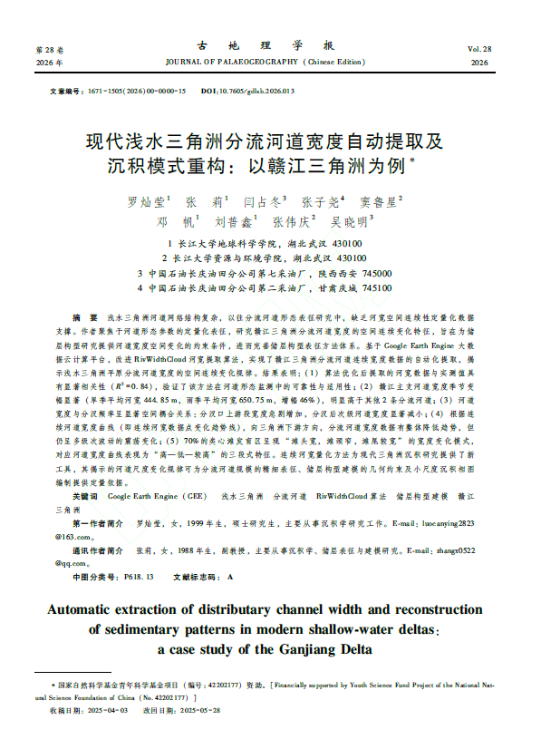 地质学2023级硕士研究生罗灿莹以第一作者身份在中文核心期刊《古地理学报》上发表题为“基于GEE的现代浅水三角洲分流河道宽度动态演化及沉积模式重构—以赣江三角洲为例”的研究论文,西瓜视频