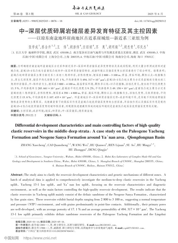 23级研究生张学成以第一作者身份在中文EI检索期刊《石油与天然气地质》上发表了题为“中-深层优质碎屑岩储层差异发育特征及其主控因素——以琼东南盆地环崖南地区古近系崖城组—新近系三亚组为例”的研究论文,西瓜视频