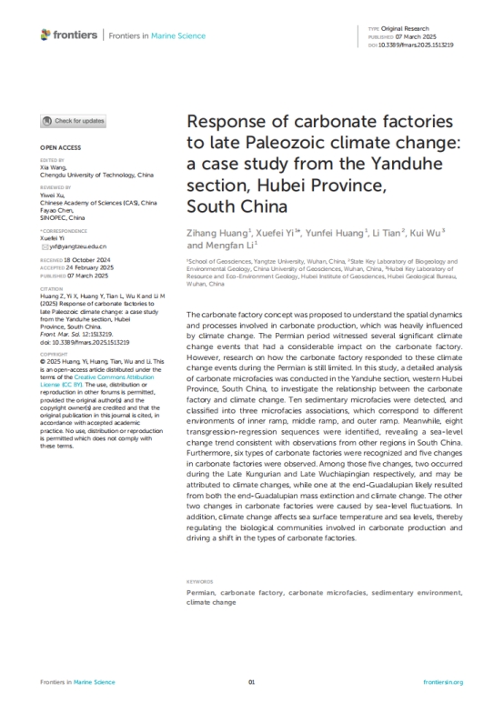 2022级研究生黄子航在海洋与淡水生物学国际2区SCI期刊《Frontiers in Marine Science》上发表题为“Response ofcarbonatefactories tolate Paleozoicclimatechange:acasestudy from the Yanduhe section, HubeiProvince, South China”的研究论文。西瓜视频