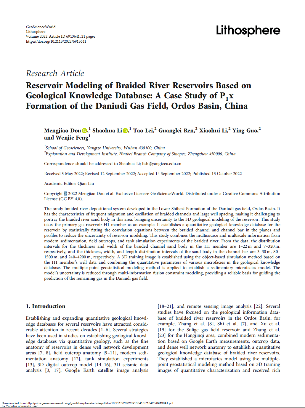 西瓜视频 博士生窦梦皎在《Lithosphere》上发表题为“Reservoir Modeling of Braided River Reservoirs Based onGeological Knowledge Database: A Case Study of P1xFormation of the Daniudi Gas Field, Ordos Basin, China”的研究论文。西瓜视频 为论文第一署名单位,博士生窦梦皎为论文第一作者,其导师李少华为通讯作者。
