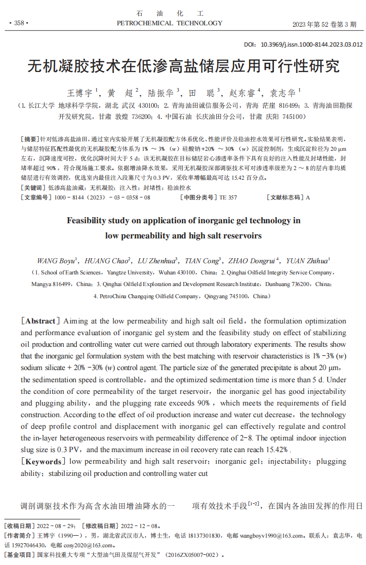 西瓜视频 博士生王博宇在《石油化工》上发表论文研究无机凝胶技术在低渗高盐储层的应用