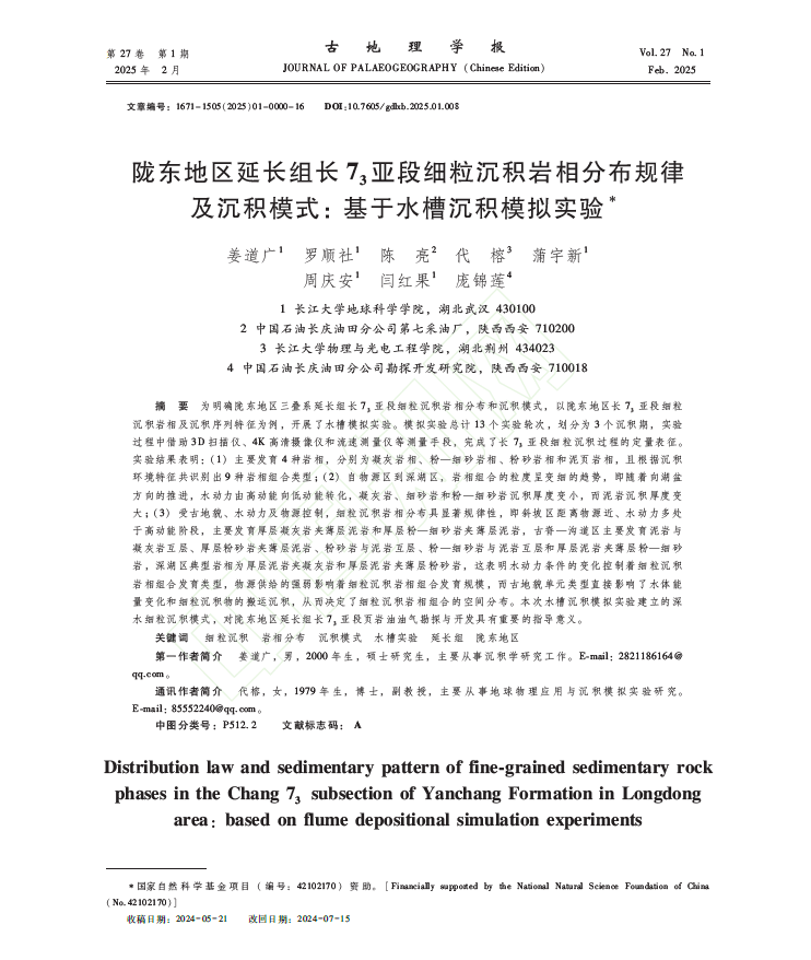 硕士生姜道广在《古地理学报》上发表题为“陇东地区延长组长73亚段细粒沉积岩相分布规律及沉积模式:基于水槽沉积模拟实验”的研究论文。该论文,以陇东地区长73亚段细粒沉积岩相及沉积序列特征为例,开展了水槽模拟实验并借助3D扫描仪、4K高清摄像仪和流速测量仪等测量手段,完成了长73亚段细粒沉积过程的定量表征。