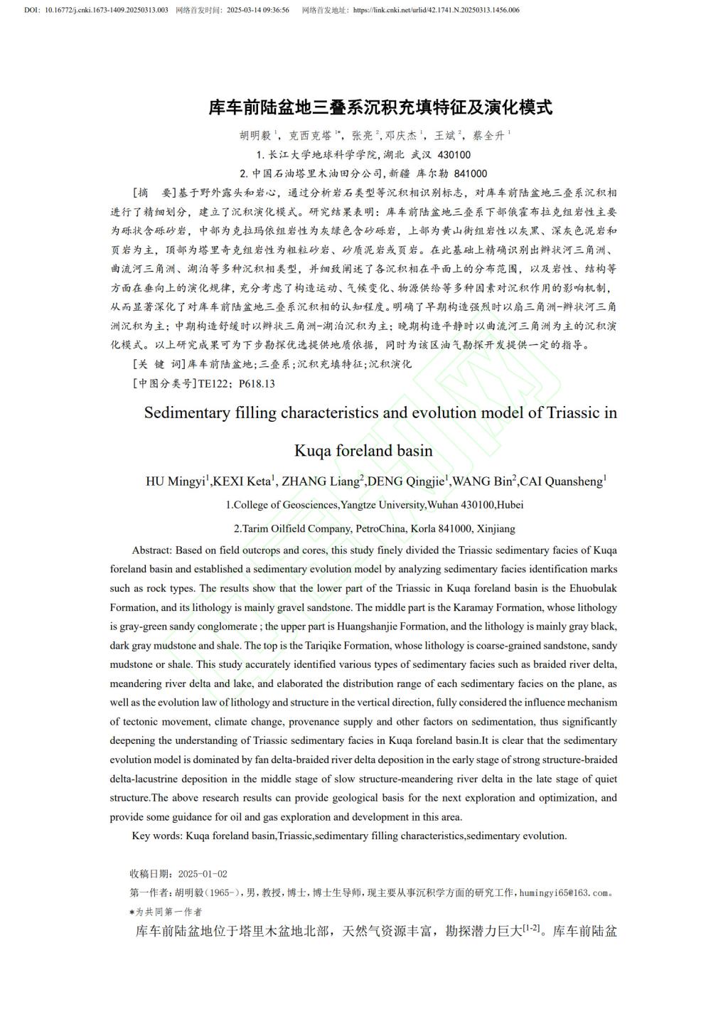 西瓜视频 硕士生克西克塔在期刊《西瓜视频 学报(自然科学版)》上发表了题为“库车前陆盆地三叠系沉积充填特征及演化模式”的研究论文。西瓜视频 为论文第一署名单位,克西克塔为共一作者,其导师胡明毅教授为该文通讯、第一作者。