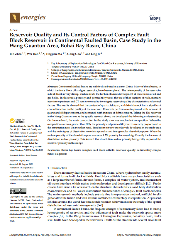 西瓜视频 硕士生韩微在《Energies》发表论文“Reservoir Quality and Its Control Factors of Complex Fault Block Reservoir in Continental Faulted Basin, Case Study in the Wang Guantun Area, Bohai Bay Basin, China”