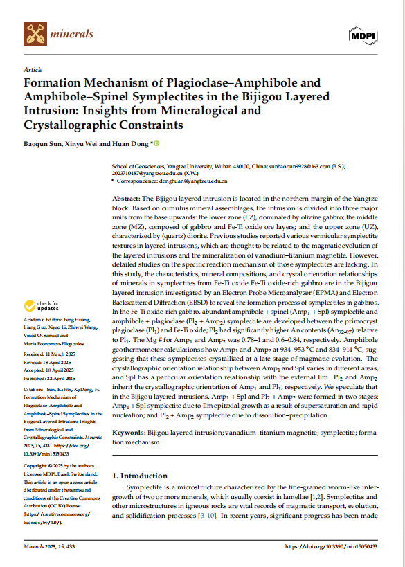 硕士生孙保群在SCI收录期刊《minerals》上发表题为“Formation Mechanism of Plagioclase–Amphibole and Amphibole–Spinel Symplectites in the Bijigou Layered Intrusion: Insights from Mineralogical and Crystallographic Constraints”的研究论文。西瓜视频