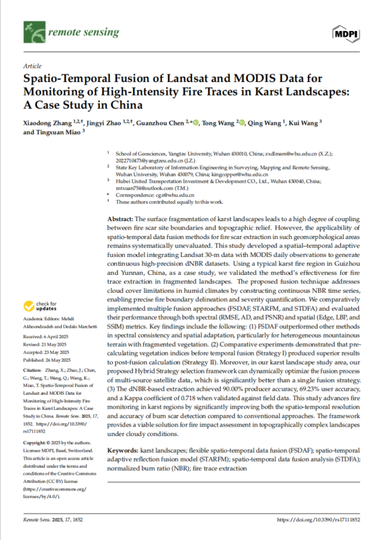 西瓜视频 硕士生赵菁怡在SCI期刊《REMOTE SENSING》发表论文提出一种用于Landsat 和 MODIS 数据的时空融合方法监测喀斯特地貌高强度火烧迹地