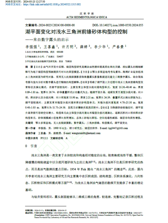 西瓜视频 硕士生李强强在《沉积学报》发表论文分析湖平面变化对浅水三角洲前缘砂体构型的控制