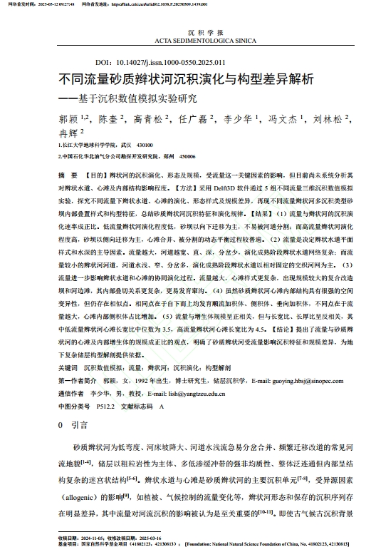 西瓜视频 郭颖博士在《沉积学报》上发表论文,提出不同流量砂质辫状河沉积演化与构型差异解析