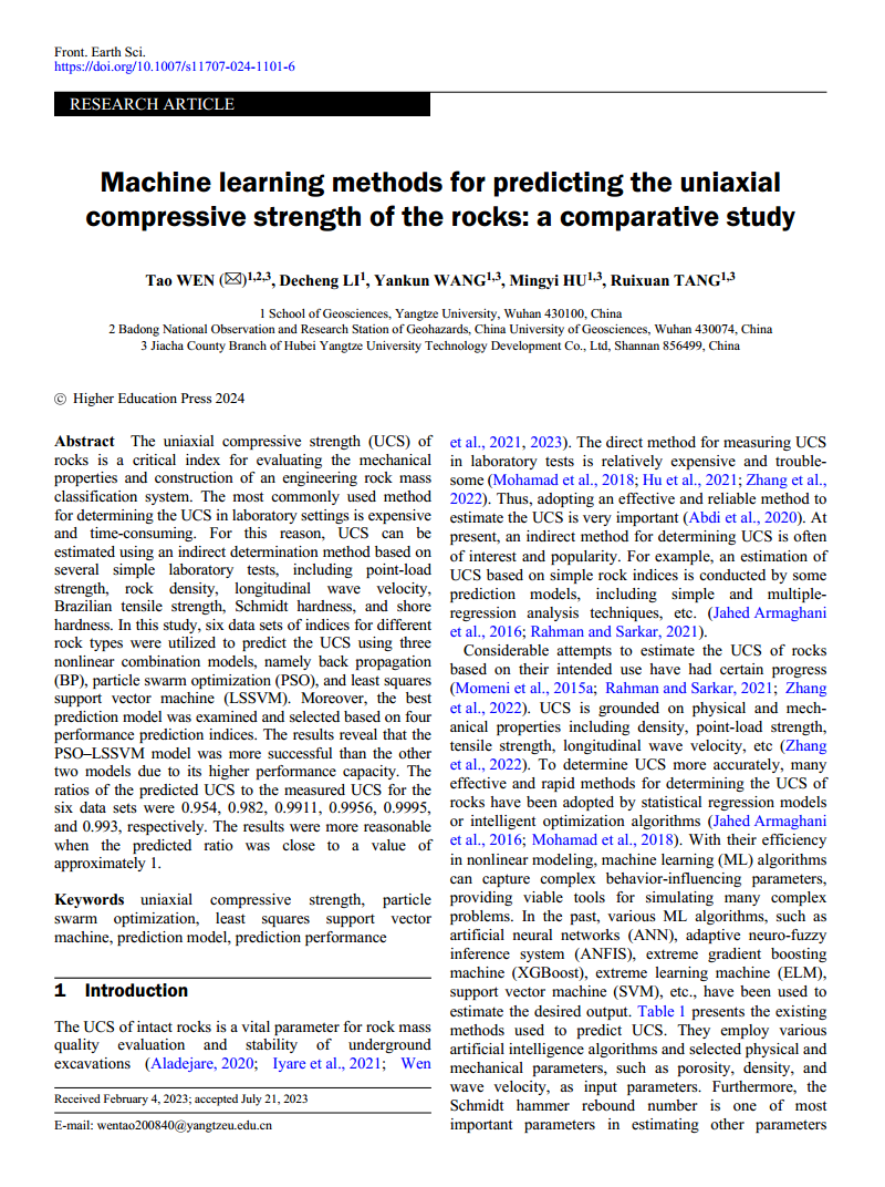 温韬教授以第一作者身份在《Frontiers of Earth Science》上发表题为“Machine learning methods for predicting the uniaxial compressive strength of the rocks: a comparative study”的研究论文。西瓜视频