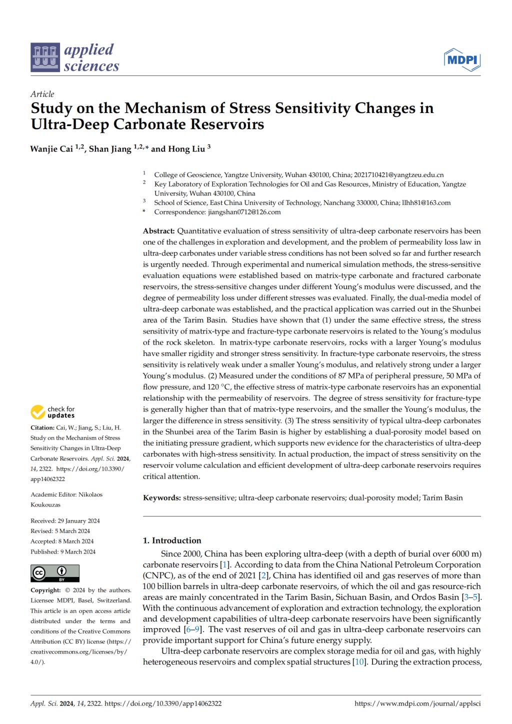 硕士生蔡万杰在《Applied sciences》发表题为“Study on the Mechanism of Stress Sensitivity Changes inUltra-Deep Carbonate Reservoirs”的研究论文。西瓜视频