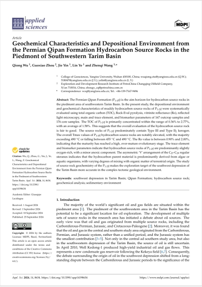 西瓜视频 吴琼博士以第一作者身份在《Applied Sciences》上发表题为“Geochemical Characteristics and Depositional Environment from the Permian Qipan Formation Hydrocarbon Source Rocks in the Piedmont of Southwestern Tarim Basin”的研究论文,西瓜视频 为论文第一署名单位,吴琼为论文第一作者,导师王振奇为通讯作者。