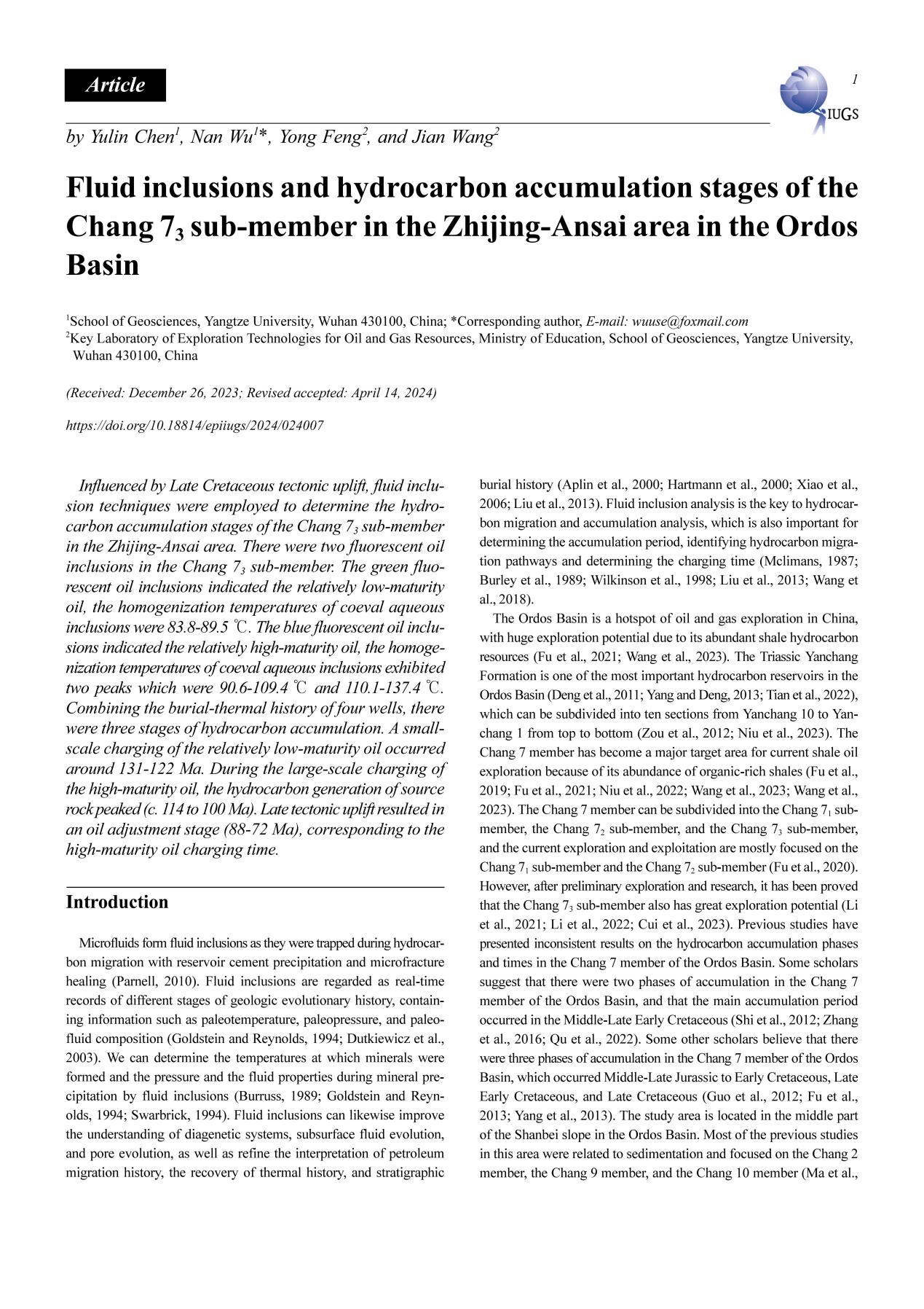 西瓜视频 硕士生陈雨霖在《EPISODES》上发表题为“Fluid inclusions and hydrocarbon accumulation stages of the Chang 73 sub-member in the Zhijing-Ansai area in the Ordos Basin”的研究论文。西瓜视频 为论文第一署名单位,硕士生陈雨霖为论文第一作者,教师吴楠为通讯作者。