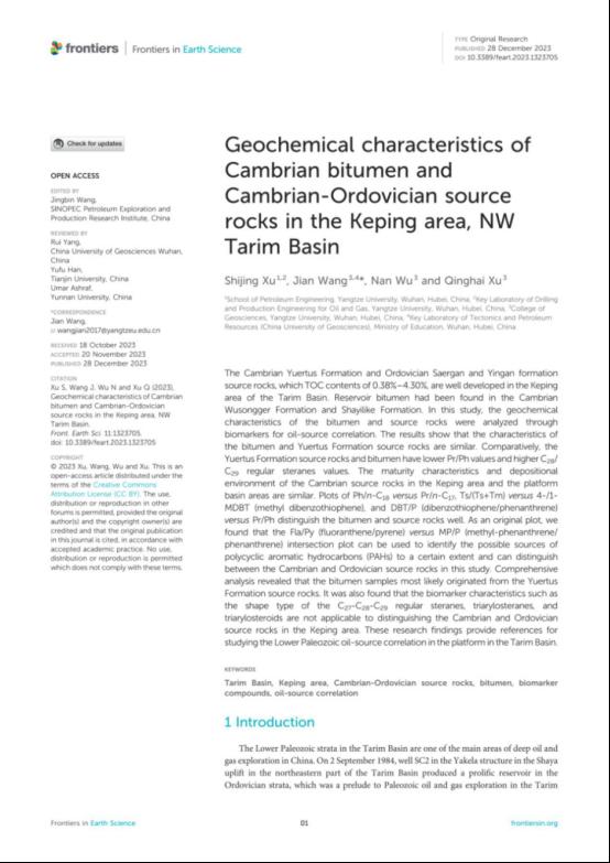 西瓜视频 王健在《Frontiers in Earth Science》发表题为“Geochemical characteristics of Cambrian bitumen and Cambrian-Ordovician source rocks in the Keping area, NW Tarim Basin”的研究论文。西瓜视频 为论文第一署名单位,教师王健为通讯作者。