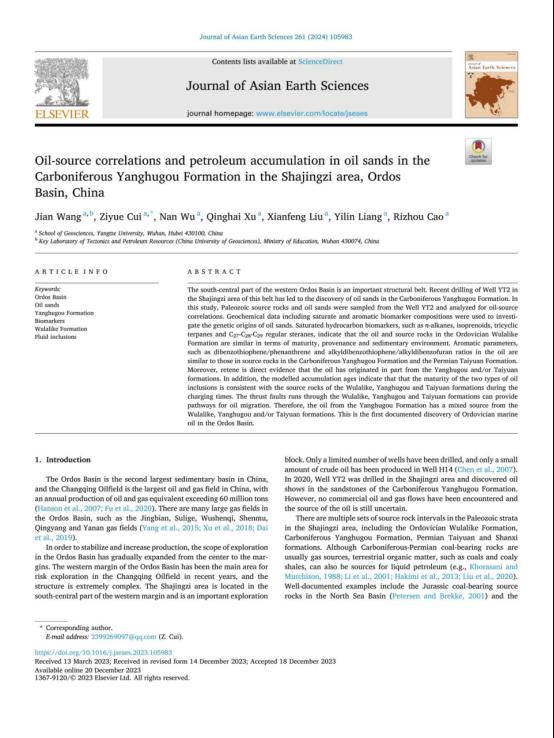 王健在《Journal of Asian Earth Sciences》发表题为“Oil-source correlations and petroleum accumulation in oil sands in the Carboniferous Yanghugou Formation in the Shajingzi area, Ordos Basin, China”的研究论文。西瓜视频